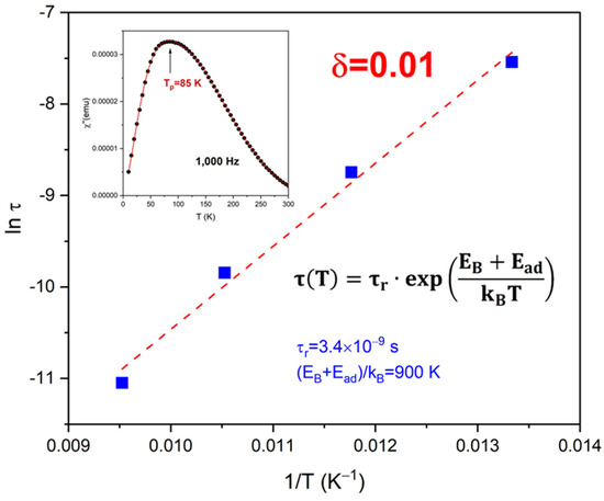 Relaxation time, τ = 1/2πf, of the highly-diluted ferrofluid, δ = 0.01, as a function of the inverse temperature 1/T. The temperature corresponding to each frequency was determined from the peak of the respective χ″ vs. T|f curve, as shown in the inset (black symbols). The solid blue squares show the data, whereas the red dashed line is the best fit to an activation type law .