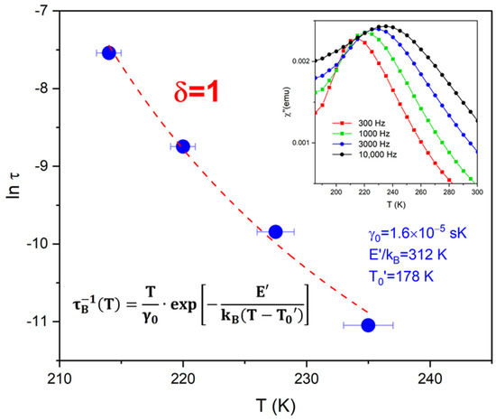 Finally, we note that the temperatures of both sets of peaks, Tp1 (around 75 K) and Tp2 (around 225 K), shift upwards upon the increase in the alternating magnetic field frequency from f = 300 Hz (red symbols) to 1000 Hz (green symbols), 3000 Hz (blue symbols), and 10,000 Hz (black symbols). This is important, because it allows us to determine the temperature dependence of the relaxation time, and compare it with predictions made by phenomenological models in order to get more insight into the microscopic details of the superspin dynamics, as described below.