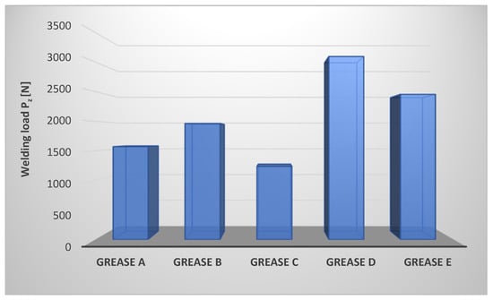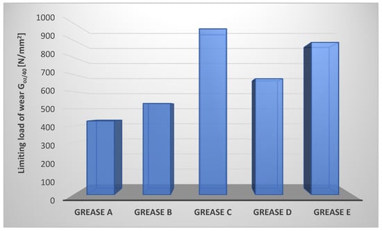 The anti-scuffing properties of the lubricating greases tested under abruptly increasing friction loads depend on the nature of the dispersed phase, which has a significant effect on the durability of the lubricating film (Figure 1). The most favorable anti-scuffing properties were found for a composition in which the amorphous silica Aerosil was used as a thickener (grease D) and for a composition in which the dispersed phase was layered aluminosilicate–montmorillonite (grease E). On the other hand, the lowest anti-scuffing properties were obtained with a composition in which calcium stearate was used as the dispersed phase (grease C). Lubricating compositions based on the rapeseed oil thickened with lithium stearate (grease A) and aluminum stearate (grease B) are characterized by intermediate values of the determined parameter. The value of the welding load Pz for composition D (thickened with amorphous silica) is 150 [%] higher than the value of this parameter for composition C, in which calcium stearate was used as the dispersed phase). Thus, the analysis shows that the most effective anti-scuffing protection with a stepwise increase in the load on the friction node is represented by the lubricating composition in which Aerosil–amorphous silica was used as a thickener, while the least effective anti-scuffing action was found for the composition in which calcium stearate was used as the dispersed phase.