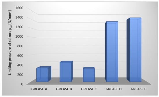 The determined values of the limiting pressure of seizure showed different levels of anti-scuffing properties of the tested grease compositions. Depending on the used thickener, the value of the parameter determining the level of anti-scuffing properties for the tested lubricating greases changed significantly. The composition E, where the montmorillonite-containing layered aluminosilicates were used as the dispersed phase, was characterized by the highest value of the poz parameter. Composition D, where Aerosil–amorphous silica was the dispersed phase, is characterized by a high value of the poz parameter similar to composition E. The lowest value of this parameter was observed for grease C, where calcium stearate was the dispersed phase. The compositions A, B, and C are characterized by comparable values of the limiting pressure of seizure poz, which reflects the level of their anti-scuffing properties. The value of the limiting pressure of seizure is poz for composition E (thickened with montmorillonite) is more than four times and for composition D (thickened with amorphous silica) almost four times higher than the value of this parameter for composition C, in which the calcium stearate was used as the dispersed phase.