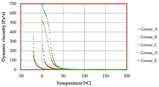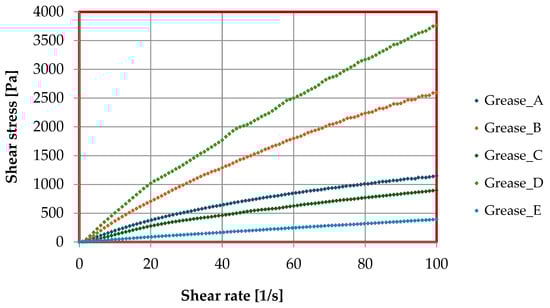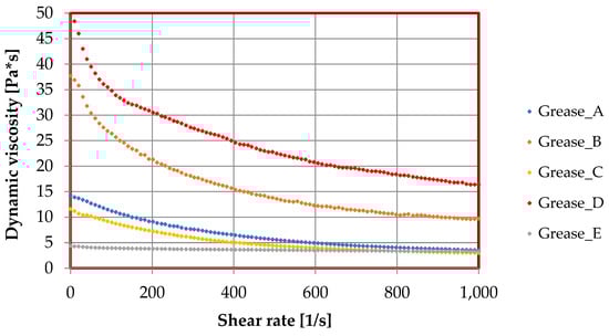Viscosity curves (the dependence of viscosity from temperature or shear rate) were determined for the same greases on the same apparatus at a constant shear rate of 100 [s−1] over a wide temperature range (−20 ÷ 180 [°C]) and at a constant temperature of 20 [°C] in the shear rate range 0 ÷ 1000 [s−1] [33,45,46,47,48,49,52].