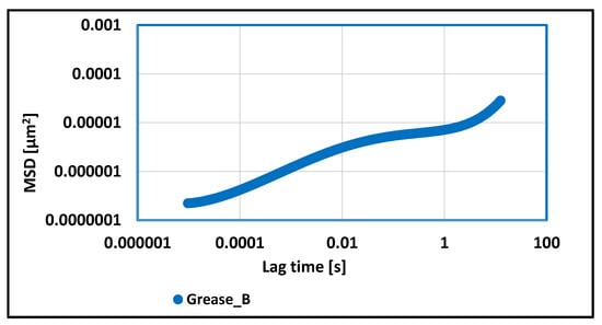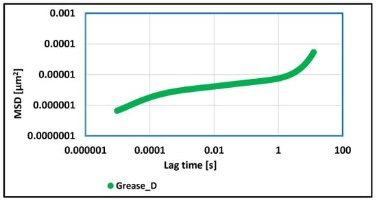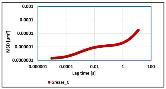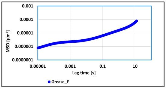 The dependence of the MSD correlation function on time and the dependence of the G′ and G″ modulus values on frequency were carried out for the produced lubricating compositions. The test results of the mentioned dependencies are shown in Figure 9, Figure 10, Figure 11, Figure 12, Figure 13, Figure 14, Figure 15, Figure 16, Figure 17 and Figure 18.
