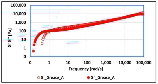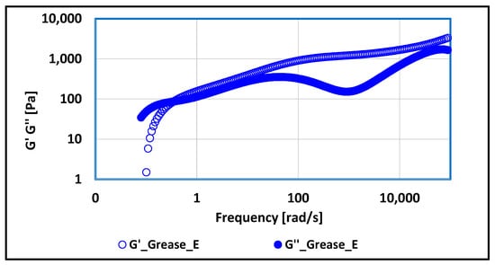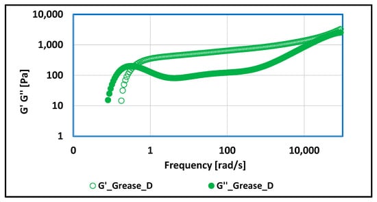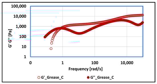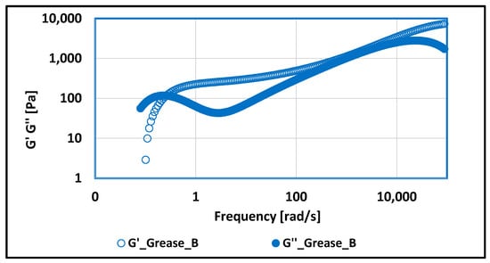 The use of aluminum soap as a thickener for vegetable lubricating grease caused significant changes in the rheological properties compared with the lubricating composition produced from vegetable oil and thickened with lithium soap. For grease B (Figure 15), it was observed that, in the very low-frequency range (up to 0.22 [rad/s]), the viscous characteristics predominate. Then, as the frequency increases up to a value of 100,000 [rad/s], the higher values are adopted of the G′ modulus characterizing the elastic–fluid–characteristics. In this way, the tested lubricating composition is diluted under the influence of the applied mechanical forces. The characteristics of the tested lubricant were changed towards the liquid state, causing a change in the chemical structure; however, there was no complete degradation of the tested lubricant because, across the range of frequency, the lubricating composition was characterized by viscoelastic properties. Thus, depending on the extortions, to which the lubricant was subjected, its properties tend to be either a solid or a liquid.