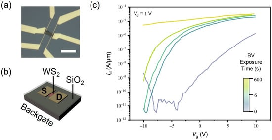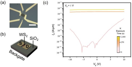 WS2 was mechanically exfoliated from a single crystal source (HQ Graphene, Groningen, The Netherlands) onto a 50 nm SiO2/p+-Si substrate. Then, monolayers were identified under microscopes with their optical contrast. For a back-gated field-effect transistor (FET), source and drain contacts were patterned via electron beam (e-beam) lithography using PMMA (C4, MicroChem, Austin, TX, USA) as an e-beam resist followed by the e-beam evaporation of Ti/Au (5/25 nm) for electrodes. Electrical measurements were performed with the B1500A semiconductor device parameter analyzer (Keysight, Santa Rosa, CA, USA).