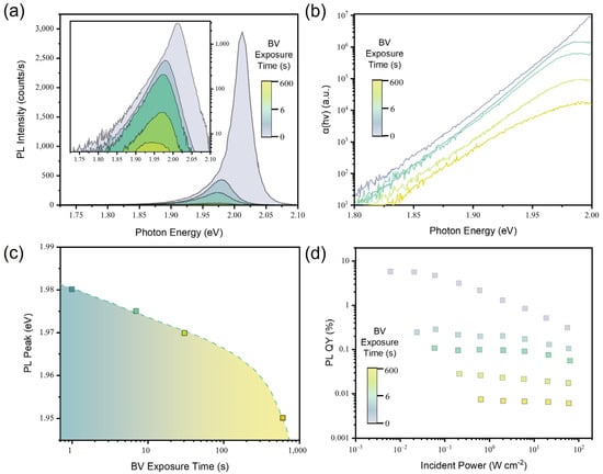 (a) PL spectra of the WS2 monolayer measured at an incident power of 2 W/cm2 with increasing BV exposure time. (b) The Urbach tail of the WS2 monolayer as a function of BV exposure time. (c) The relationship between PL peak position and BV exposure times. (d) Incident power-dependent PL QY of the WS2 monolayer with increasing BV exposure time.