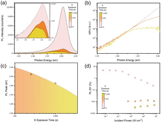 Similarly, WS2 monolayers with K doping were characterized by their PL emission spectra, as provided in Figure 5a. The same trend of decrease in PL intensity is observed in the WS2 monolayer after K doping. In contrast to the BV-doped WS2 monolayer, the neutral exciton emission peak remains and coexists with a trion emission peak when K doping is applied. This is possibly a consequence of a change in trion formation coefficient, triggered by strong binding between the K dopant and S plane in the lattice structure of WS2 []. K doping does not bring about the introduction of defects or disorders which can act as recombination centers. As shown in Figure 5b, the preserved slope of Urbach tails suggests that there is no lattice distortion or change in the density of states near the band edge upon K doping. With the increasing amount of K doping, the PL emission peak is shifted to a lower photon energy, owing to the increase in the trion population, as shown in Figure 5c. In the same way as BV doping, Figure 5d shows the decreased PL QY of the WS2 monolayer after K doping. It should be noted that the maximum duration of BV and K doping is determined to the highest level possible within the range where the PL signal can still be distinguished from the background. In order to maximize the signal-to-noise ratio and widen the range of incident powers for evaluating the optical properties of BV- and K-doped WS2 monolayers, the strategy to enhance light-matter interactions can be employed. For example, the introduction of nanostructures to increase outcoupling modes will enable a broader range of doping conditions and excitation powers. Furthermore, as a follow-up study, the altered photocarrier dynamics can also be examined upon the inclusion of nanostructures or nanoparticles based on free-carrier semiconductors [,].