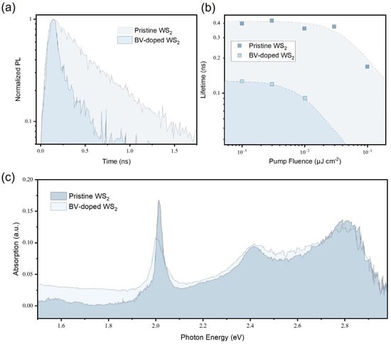 Moreover, dynamic luminescence behaviors were investigated for the WS2 monolayer before and after BV doping. Figure 6a presents the time-resolved PL decay of a WS2 monolayer to show the effect of BV doping on its recombination kinetics. Here, the radiative decay curves were fit by single exponential decay curves to extract lifetimes. As a result, the pristine WS2 monolayer exhibits a luminescence lifetime of ~0.4 ns, which is consistent with a previous report []. The lifetime of the WS2 monolayer then decreased to ~0.1 ns after 1000 s of BV exposure. Time-resolved PL measurements were performed with varying pump fluences, as shown in Figure 6b. At all pump fluences, it appears that BV doping shortens the lifetime of the WS2 monolayer, arising from the fact that the luminescence decay is mainly dictated by the trion nonradiative recombination after BV doping to transfer the high density of electrons in the monolayer. It should be noted that the lifetime becomes shorter with increasing pump fluences owing to the exciton–exciton annihilation []. Photocarrier dynamics can also be evaluated using transient absorption spectroscopy, which enables one to capture the ultrafast decay of excited states. However, transient absorption spectroscopy requires higher pump intensity compared to time-resolved PL spectroscopy, limiting the dynamic range of measurement for recombination kinetics []. Figure 6c shows the absorption spectra of the pristine WS2 monolayer in comparison with the WS2 monolayer after 1000 s of BV exposure. While there was no measurable difference in terms of shapes and resonances between the two absorption spectra, the peak near the band edge of WS2 shows ~30 meV redshift after BV doping. This is consistent with the PL shift induced by doping, which is associated with the trion formation from neutral excitons.