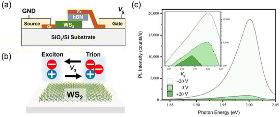 (a) Schematic describing the top-gated device structure. The top graphene layer acts as a gate electrode to apply electrostatic doping onto the WS2 monolayer, while the bottom graphene is electrically ground. (b) Gate voltage-dependent modulation of PL in the WS2 monolayer enabled by adjusting the exciton and trion density. (c) PL spectra of the WS2 monolayer with gate voltages of Vg = −20 V, 0 V, and +20 V measured at an incident power of 1 W/cm2.