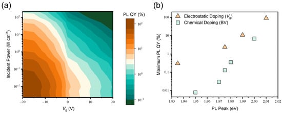 The relationship between the maximum PL QY and the PL peak position of the WS2 monolayer under electrostatic and chemical doping is presented in Figure 8b. This result suggests that both doping methods (Electrostatic and BV) cause plenty of free electron injection followed by trion formation, leading to the dominance of nonradiative recombination. It is shown that BV doping suppresses the PL QY of the WS2 monolayer more significantly than electrostatic doping, curtailing the maximum PL QY by almost three orders of magnitude. This discrepancy between the two doping types originates from the fact that the free electron concentration of the BV-doped WS2 monolayer is higher than the electrically-doped WS2 monolayer. Moreover, it has been reported that the chemical doping methods (BV and K) studied in this work are known to induce degenerate doping effects, lifting the Fermi level near to the conduction band edge [,].