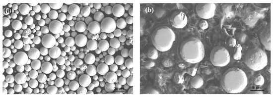 The tungsten feedstock powder was prepared by plasma spheroidization (Shenzhen Xingchen Inc., Shenzhen, China), with a nominal purity of 99.96% and an oxygen content lower than 200 ppm. The powder showed fairly good spherical shapes and a smooth surface (Figure 1a). Nearly no adhered satellite particles were observed, but there existed some incompletely spheroidized particles of much smaller size, showing irregular shapes. Furthermore, no inner pores were observed from the cross-sectional view (Figure 1b). The powder size was measured in the range of 4.5–26.2 μm, with D10 of 5.1 μm, D50 of 13.9 μm, and D90 of 21.7 μm. The used tungsten powder size was much smaller than that normally used in the LPBF process, which was typically in the range of 5–45 μm.