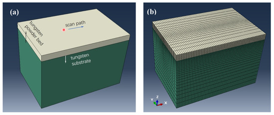The thermo-physical properties of the tungsten substrate and powder bed for FEA modeling were summarized in Table 3 with reference to [30]. A simplified JC model was used for the constitutive mechanical behavior of the pure tungsten in the following equation, where the thermal softening effect was negligible.