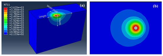 Taking M-VED as an example, Figure 4a shows the typical three-dimensional morphology of the moving laser beam. The size and shape of the laser-heat-affected zone can be observed by sectioning the center part. For the simulated three sets, it seems that the VED has no effect on the dimension of the laser heat-affected size, with a length of 0.26 mm, width of 0.24 mm, and depth of 0.12 mm. With the moving laser spot, the affected zone exhibits a slight elliptical shape, with the aspect ratio of length to width being 1.08. The molten pool size is the critical indicator for understanding the laser–matter reaction during the printing process. If the molten pool is defined as the area where temperature is higher than the tungsten melting point (3422 °C), as shown in the gray area in Figure 4b, the molten pool is dependent on the VED, as presented in detail in Figure 5.