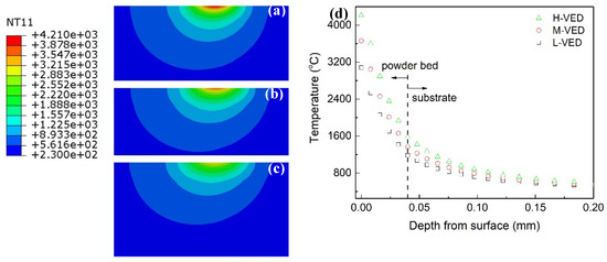 Temperature distribution field along depth in (a) H-VED, (b) M-VED, and (c) L-VED with the same calebar, and (d) the comparison of the profiles.
