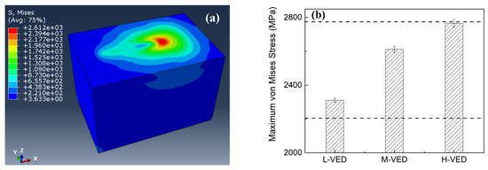 Figure 6 presents a typical von Mises stress distribution during printing in the case of M-VED. Because of the fast heating and cooling in the laser–tungsten interaction, there exists a steep stress field. The maximum stress in M-VED can be as high as 2612 MPa, which is slightly higher than the yield stress (2544 MPa) but lower than the yield stress (about 2783 MPa in [31]). The maximum stress appears on the top surface, decreasing with depth in the powder bed. To exhibit a clearer and more general trend, the maximum von Mises stress at the four calculation timesteps was evaluated for an average value. Figure 6b summarizes the maximum von Mises stress in all the cases with varying VED. In the present simulated processing parameters, no residual stress is higher than the tensile stress of tungsten. However, due to the high cooling rate on the surface, cracks have been indeed observed on surface in experimental results in the following sections.