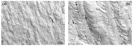 Furthermore, as shown in Figure 7b, a certain density of cracks exists on the surface, and most of them are parallel to the scanning direction (black arrows). And they are located at the scan track boundaries, which are almost the overlapping areas of adjacent scans. Such parallel cracks can be attributed to the complex residual stress field due to the heating–cooling cycles in such areas. On the other side, a few cracks across the scan tracks have also been observed. These cracks are nearly normal for laser spot arcs. These two types of surface cracks are in compliance with many results reported in ref [16,18,21,28], where cracks formed network shapes due to the two types of crossed directions. However, compared to the reported crack networks, the crack density in this work is much lower. As in Figure 7, no crack networks can be clearly observed.
