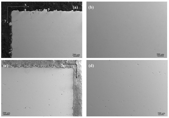 The typical transverse morphology of the polished LPBF tungsten with VED of 291.7 J/mm3 and xy and yz sections: (a) edge and (b) center areas of xy section; (c) edge and (d) center areas of yz section.