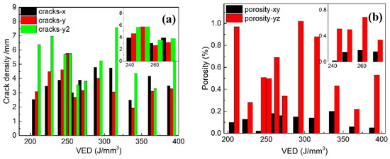 The relationship of defects with laser volumetric energy density: (a) crack density; (b) porosity.