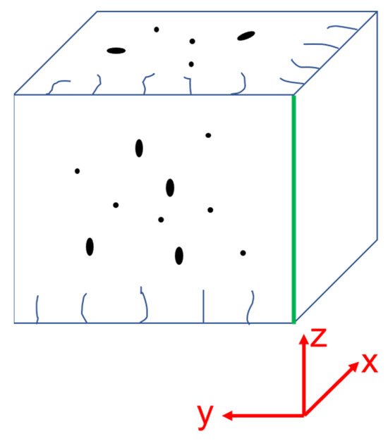 To understand the cracking behaviors in LPBF tungsten, a phenomenal relationship has been constructed by statistical analysis. For the 12 printed tungsten samples, the varying coupled parameters of laser power and scan velocity can be unified into the laser VED. Figure 10 shows the relationships of crack density and porosity with VED on the xy and yz sections; the inset subfigure magnifies data in the VED range of 235–275 J/mm3. In Figure 10a, y2 indicates the crack density along the y direction on the yz section. Combining qualitative (Figure 7 and Figure 8) and quantitative (Figure 10) analysis, the defects of cracks and pores in printed tungsten can be phenomenologically reconstructed in Figure 11.