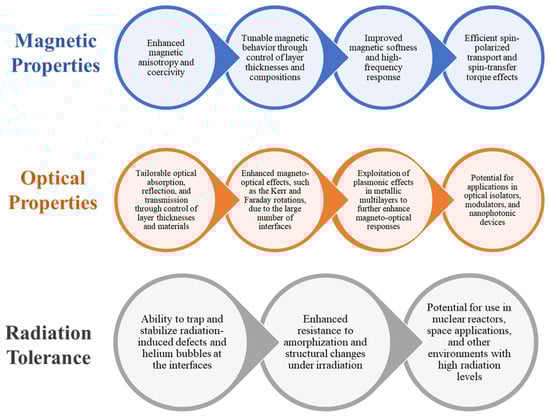 NMMCs have been reported to exhibit unique optical properties, finding numerous varied applications. NMMCs can exhibit plasmon resonance, which is a phenomenon where the electrons in the metal layers oscillate in response to incident light, leading to enhanced light absorption and scattering [10]. This property has been used in the development of plasmonic sensors, surface-enhanced Raman spectroscopy (SERS), and photovoltaic devices [10]. They also display optical interference, which is a phenomenon where the light waves reflected from the different layers of the material interfere with each other, leading to enhanced or suppressed reflection and transmission. This property has been used in the development of optical filters, mirrors, and anti-reflection coatings [11]. Additionally, NMMCs have nonlinear optical properties, which are optical effects that are proportional to the square or higher powers of the incident light intensity. Nonlinear optical devices like frequency doublers and optical switches have developed using this property [10]. NMMCs have shown a wide range of exceptional magnetic, optical, and radiation tolerance properties that differ significantly from their monolithic counterparts. These properties can be broadly categorized into three main areas. In this regard, Figure 1 shows the NMMCs’ evolution roadmap.