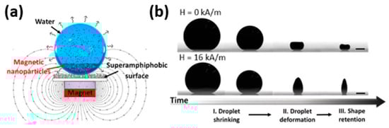 Superparamagnetic supraparticles. (a) The experimental setup for the evaporation-guided assembly of a magnetic nanoparticle dispersion on a superamphiphobic surface that produces supraparticles, and (b) the drying process of a 3% weight droplet in the absence (upper panel) and presence (bottom panel) of a magnetic field. Note that a 0.5 mm scale bar is used [57].