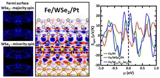 Unfolded Fermi surface WSe2 monolayer from the Fe/WSe2/Pt heterostructure along with its structure and spin Seebeck coefficient (Sspin) as a function of chemical potential (μ) [71].