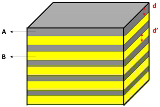 Diagram showing ferromagnetic A and non-magnetic B layers in magnetic multilayers. Note that d and d′ indicate the layer’s thickness.