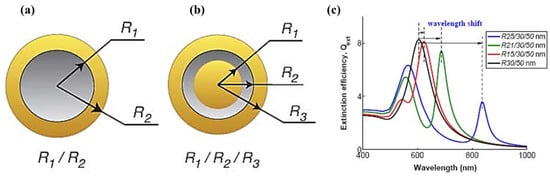 The schematic representation of (a) conventional silica–gold core nanoshells, (b) multilayer gold–silica–gold nanoshells, and (c) conventional silica–gold core and multilayer gold–silica–gold nanoshell calculated spectra with different inner core radii but the silica and outer radii staying the same (Media 1). Note that the lambda shift indicates the multilayer gold–silica–gold nanoshells’ red shift from the conventional silica–gold core nanoshells [85].