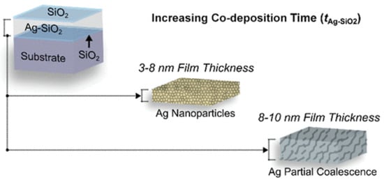 A third study demonstrated that varying co-sputtering can manipulate the structural features and optical properties of nanocomposite Ag-SiO2 films [87]. When compared to traditional all-dielectric multilayer optical media, co-sputtering of nanocomposite metal–dielectric films presents an enticing path toward ultrathin film coalescence and customizable optical properties to achieve high-precision optical performance at significantly reduced film thicknesses. In the study of Sun et al. [87], through magnetron co-sputtering in a regulated pure argon atmosphere, silicon dioxide (SiO2) was used to create contiguous silver (Ag) networks and Ag nanoparticles embedded in the material at room temperature, as shown in Figure 7. It was observed that by altering the co-sputtering duration at film thicknesses of approximately 3–10 nm, the structural characteristics and optical attributes of nanocomposite Ag-SiO2 films can be controlled. After Ag phases transition from nanoparticles to the partially coalesced network, a clear optical response transition takes place. At these reduced film thicknesses, significant variations in the measured optical intensity are seen: maximum ΔT = 67%, ΔR = 28%, and ΔA = 46% in the visible and near-infrared regions. It was demonstrated that optimizing the refractive index (n) and extinction coefficient (k) of ultrathin-metal-film optical materials is anticipated to yield workable approaches for the creation, deposition, and integration of next-generation complex index multilayer optical filters and mirrors with improved precision spectral performance [87].