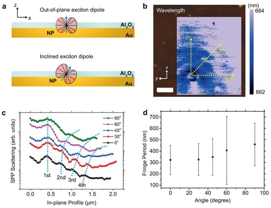 Analysis of fringe patterns: (a) the diagram illustrates the exciton transition dipole’s schematic representation, with the top figure showing its out-of-plane orientation and the bottom figure demonstrating its inclined angle; (b) the near-field emission wavelength map of Al2O3 (5 nm)/NP/Au is displayed with a topography background; (c) the line-cuts of TEPL intensity at various direction angles; and (d) the fringe period expressed mathematically as a function of the angle. Note that the error bar corresponds to the full width at half maximum (FWHM) of the peak observed in the Fourier transform of the fringe profiles in (c). The scale bar represents 0.5 µm [91].