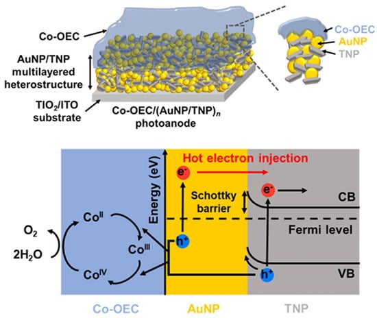 - Kim, J.; Son, H.Y.; Nam, Y.S. Multilayered Plasmonic Heterostructure of Gold and Titania Nanoparticles for Solar Fuel Production. Sci. Rep. 2018, 8, 10464. [Google Scholar] [CrossRef]