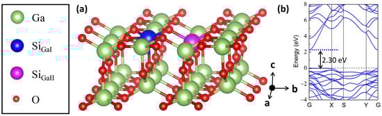 (a) The model of Si-doped 2D β-Ga2O3 structure. The O and Ga atoms are represented by the red and green spheres, respectively. The replaced GaI and GaII doping positions with a Si atom are indicated by the blue and magenta colors, respectively. (b) Band structure of undoped 2D β-Ga2O3 unit cell calculated by PBE functional. In this work, G (0, 0, 0), X (0.5, 0, 0), S (0.5, 0.5, 0), and Y (0, 0.5, 0) are set as the high symmetry points, respectively.