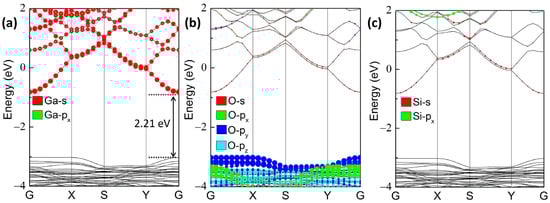 Figure 1b shows the band structure of perfect 2D β-Ga2O3, where the CBM is situated at the G point, whereas the VBM is positioned between the G and X points, demonstrating an indirect band gap semiconductor character. The calculated band gap of 2D β-Ga2O3 is 2.30 eV, which agrees well with previous works [45,47], but it is lower than the value of 3D β-Ga2O3 [48,49]. As shown in Figure 2, after substituting the tetrahedrally coordinated GaII with one Si atom, the band gap was slightly reduced to 2.21 eV. Moreover, the shift of VBM from the non-G point (between the G and X points) to the G point resulted in the direct band gap nature. These observations are consistent with the results in ref. [31]. Additionally, the orbital-projected band structures in Figure 2a–c illustrate that the majority of the VBM of SiGaI is composed of O-2p orbitals, whilst the CBM is mainly contributed by Ga-4s and small quantities of O-2s and Si-3s orbitals.