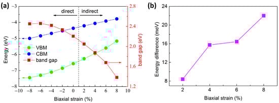 (a) Evolutions of band edges relative to the vacuum level and band gaps of SiGaII with respect to biaxial strains. (b) The energy differences between the indirect and direct band gap versus biaxial tensile strains in SiGaII structure.