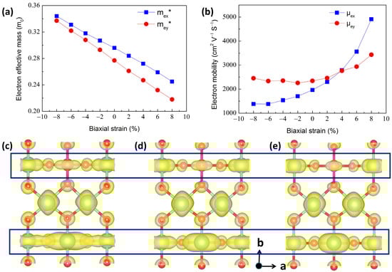 (a) Electron effective masses of SiGaII versus biaxial strains. (b) Electron mobility of SiGaII relative to biaxial strains. Partial charge distributions at the CBM for SiGaII in three different strain cases: (c) 0%, (d) +4%, and (e) +8%. The isosurface level was measured at 0.001 e/Å3. The blue square box highlights the changes of the wave-function of the CBM along a direction.
