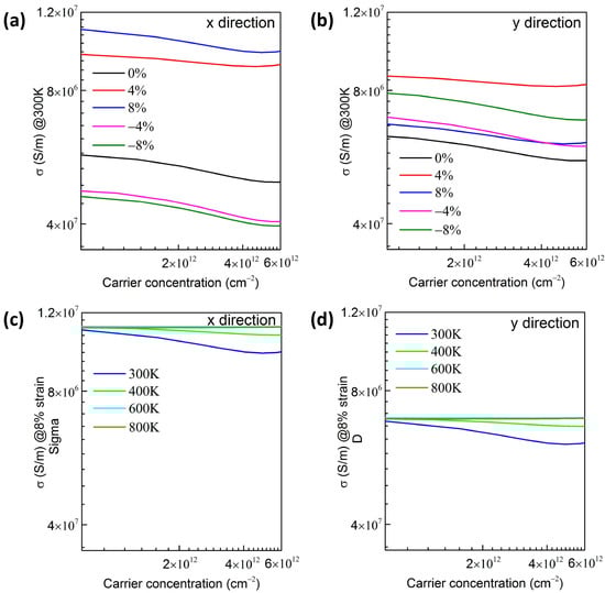 The σ for n-type SiGaII configuration at 300 K along (a) x direction and (b) y direction relative to carrier concentration. The σ of SiGaII configuration with 8% strain along (c) x direction and (d) y direction with different temperatures.
