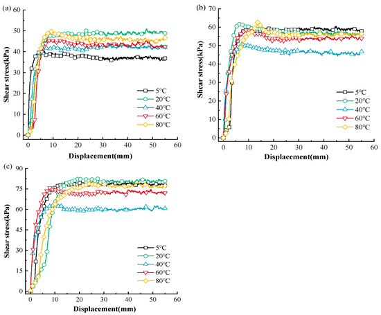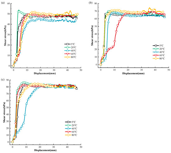 The correlation curves between the shear displacement and shear stress of MSW under post-cyclic monotonic shear loading at various temperatures are depicted in Figure 4, and the post-cyclic MSW peak shear strength–temperature relationship is shown in Figure 7.