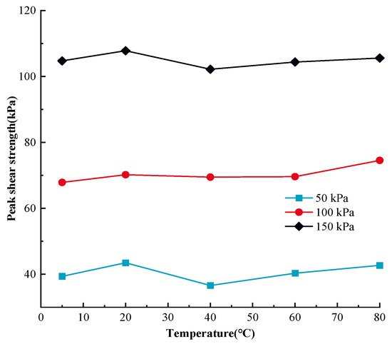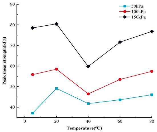 Based on Figure 1 and Figure 2, the MSW exhibited a displacement (strain) hardening behavior in all tests, without an obvious post-peak reduction in shear strength. This is in line with the regularity found in previous studies on the mechanical properties of MSW [81,82]. The displacement and shear stress relationship of the MSW, shows a temperature dependency at all temperatures studied. Additionally, the MSW mechanical response variation rules under various normal stresses are comparable and temperature range-dependent. More precisely, the peak shear strength rises between 5 °C and 20 °C and between 40 °C and 80 °C, but the peak shear strength falls between 20 °C and 40 °C. For instance, at 50 kPa normal stress, the MSW peak shear strength increases from 37.15 kPa to 49.12 kPa and from 41.75 kPa to 46.05 kPa at the temperature ranges from 5 °C to 20 °C and from 40 °C to 80 °C, respectively, while at 20 °C~40 °C, the MSW peak shear strength is reduced from 49.12 kPa to 41.75 kPa. Furthermore, compared to other temperature ranges, the MSW shear strength is more susceptible to temperature fluctuation at 20 °C~40 °C. For instance, at 150 kPa normal stress, the MSW shear strength is reduced by 25.77% from 80.52 kPa to 59.77 kPa when the temperature rises from approximately 20 °C to 40 °C, while the MSW shear strength ascends by 2.52% and 19.83% at the ranges from 5 °C to 20 °C and 40 °C to 60 °C, respectively. Moreover, it is noted that the MSW shear strength is more sensitive to temperature changes at high normal stress than it is at low normal stress. Taking the variation rules of the MSW shear strength at 40 °C~60 °C as an example, the shear strength rises by 19.83% from 59.77 kPa to 71.63 kPa, by 15.17% from 46.46 kPa to 53.51 kPa, and by 4.41% from 41.75 kPa to 43.59 kPa under 150 kPa, 100 kPa, and 50 kPa normal stress, respectively. Moreover, at different normal stresses, the MSW peak shear strengths all reach the maximum and minimum values at the temperatures of 20 °C and 40 °C, respectively. Regarding the temperature-dependent sensitivity of the MSW peak shear strength to normal stress variation, with a rise in temperature, the sensitivity firstly decreases and then continually rises, reaching the minimum value at a temperature of 40 °C.