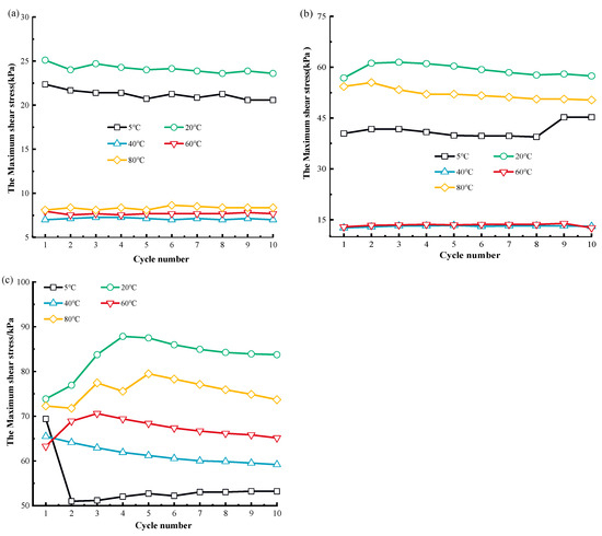 Figure 3 shows the correlation curves of the maximum MSW shear stress (the maximum shear stress in a single cyclical shear loading) under cyclical shear loading at varying temperatures.