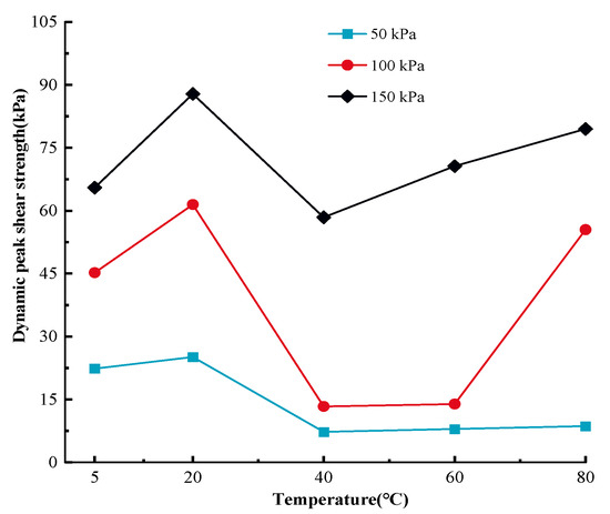 Based on Figure 4, except for the dynamic peak shear strength at 20 °C~40 °C, the MSW dynamic shear strength gradually reduces with rises in temperature. For instance, at 150 kPa, the MSW shear strength rises from 65.49 kPa to 87.83 kPa in the 5 °C~20 °C temperature range, and from 58.41 kPa to 79.48 kPa in the 40 °C~80 °C temperature range. To be more precise, the dynamic peak shear strength is more susceptible to temperature changes in the 5 °C~20 °C region than to those in the 60 °C~80 °C range. It should also be noted that the temperature-dependent MSW peak shear strength reaches its maximum and minimum values at the temperatures of 40 °C and 80 °C, respectively. Previous studies have demonstrated that plastic waste creates potential slip surfaces within the waste body [86]. Thomas et al. [87] conducted large-scale shear strength tests (1000 mm × 1000 mm) by using natural MSW samples and showed that the shear strength decreases with increasing plastic content in the MSW. Therefore, it is speculated that the dynamic shear strength of MSW decreases with an increasing temperature, mainly because the temperature affects the mechanical properties of the plastic in MSW. The test apparatus used in this paper did not have a visual window, which would have enabled us to ensure a constant temperature environment in the environmental chamber, thus not allowing for a better observation of the deformation of the MSW samples as well as the changes in the shear zone. In the future, the authors will work on solving the limitations of the test apparatus.
