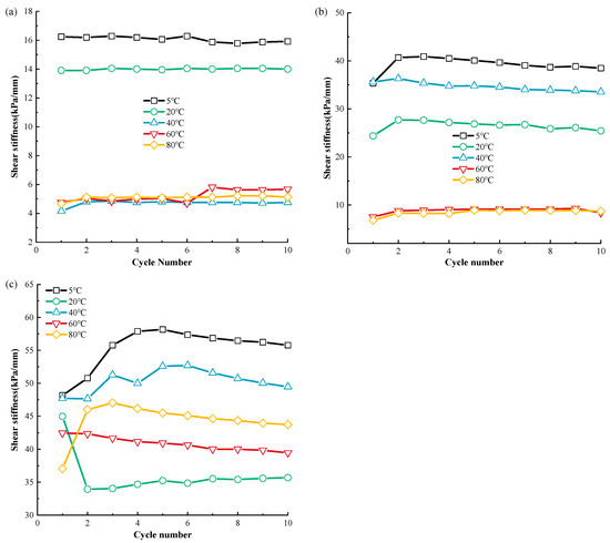 The temperature significantly affects the dynamic MSW shear rigidity, as seen in Figure 5. The MSW shear stiffness generally decreases with an increasing temperature under various normal stress, with the exception of the shear rigidity in the temperature range of 20 °C–40 °C. For instance, at 100 kPa, the shear stiffness in the first cycle decreases from 35.60 kPa to 24.36 kPa when the temperature ascends from 5 °C to 20 °C, and the shear rigidity drops from 36.33 kPa to 6.81 kPa when the temperature is elevated from 40 °C to 80 °C. Additionally, the sensitivity of the MSW dynamic shear stiffness at 5 °C~20 °C is higher than that at 60 °C~80 °C. For instance, at 50 kPa normal stress, the MSW dynamic shear rigidity in the initial cycle decreases by 14.36% from 16.23 to 13.90 when the temperature ascends from 5 °C to approximately 20 °C, while the shear stiffness is reduced by 2.17% from 4.60 to 4.50 when the temperature elevates from 60 °C to 80 °C. Regarding the variation rules of MSW’s dynamic shear rigidity during cyclic shear frequency, it is found that, except for the first number, the dynamic MSW shear stiffness during the subsequent cycle frequency is similar. This indicates that the cyclical shear number has a marginal influence on the shear rigidity.