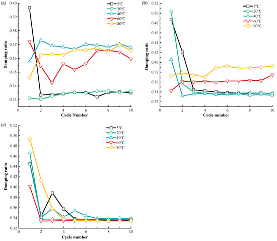Based on Figure 6, as with the dynamic MSW shear stiffness, except for the damping ratio at 20 °C~40 °C, the variation in the damping ratio with varying rising temperatures is regular, and with the increase in temperature, the MSW damping ratio gradually goes up. For example, at 50 kPa, the damping ratios in the initial cycle are 0.30, 0.33, 0.34, and 0.36 at temperatures of 5 °C, 20 °C, 60 °C, and 80 °C, respectively. The reactivity of the MSW damping ratio to fluctuations in the 5 °C~20 °C range is lower than that in the 60 °C~80 °C range, in contrast to the dynamical MSW shear elasticity. For instance, at 100 kPa normal stress, in the initial shear cycle, the damping ratio increases by 2% from 0.49 to 0.50 when ascending from 5 °C to 20 °C, while the damping ratio rises by 8.82% from 0.34 to 0.37 when the temperature is elevated from 60 °C to 80 °C. It should be mentioned that the susceptibility of the MSW damping ratio to fluctuations in temperature decreases as the normal pressure rises. Taking the change in the MSW damping ratio at temperature ranges from 60 °C to 80 °C as an example, the damping ratio increases by 15.87% from 0.315 to 0.365, by 7.69% from 0.364 to 0.392, and by 5.99% from 0.334 to 0.336. Regarding the change law of the damping ratio during cyclic shear loading, it is found that, with a rise in normal stress, the difference between the damping ratio for different cyclic shear numbers rises. As an example, there is little variation in the damping ratio across various cyclic shear values at 50 kPa normal pressure. Comparatively, the damping ratio during the initial number is significantly greater than that in the subsequent cycle numbers at 150 kPa normal pressure.