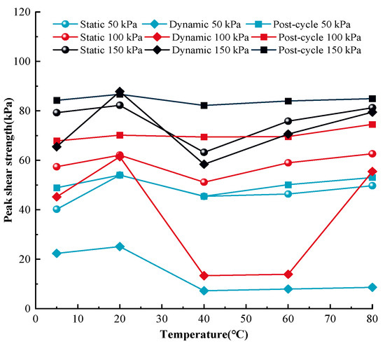 The peak shear strength of MSW under various stress statuses and temperatures are illustrated in Figure 9 in order to quantitatively compare the static, dynamic, and post-cyclic mechanical responses of MSW under monotonic, cyclic, and post-cyclic monotonic shear loading.