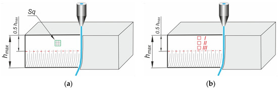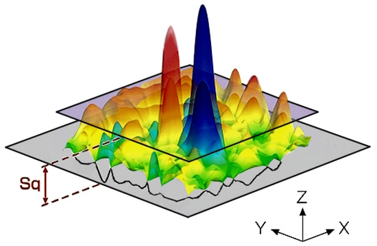 Root mean square height (Sq) was chosen as the measure of roughness. This parameter extends the contour (line of roughness) parameter Rq to 3D. It represents the root mean square for Z(x, y) within the evaluation zone (Figure 3). The Sq factor is a universal measure of the texturing surface and is insensible in differentiating tops, valleys, and the various texture spacing properties. The following equation (Equation (2)) defines this roughness factor: