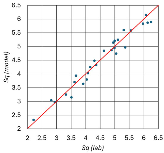 A graphic illustration of Equation (3) is presented in Figure 4. The pressure modification has no significant impact on the Sq roughness factor. Only a slight increase in roughness proportional to the increase in pressure can be observed here. This is due to a certain increase in the kinetic energy of the abrasive grains. Having greater potential, abrasive grains perform deeper micro-cutting, which increases roughness.
