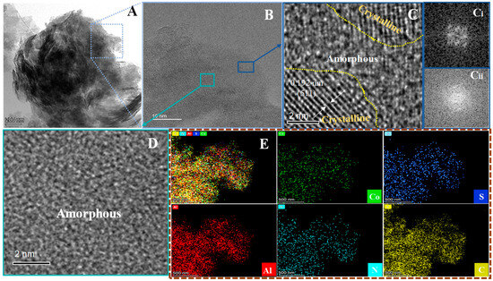The detailed morphology and microstructure of the Co(Al)S(10) were further determined using TEM (Figure 2). The low-magnification TEM image provided direct evidence that ultrathin nanosheets staggered interactively to form a 3D nanosheet-interconnected network architecture. The 3D porous network architecture could expose enough active sites for Faradaic reaction to accelerate electron/ion transfer. The interconnected amorphous and crystalline domains with clear boundaries (yellow border in blue frame) were observed in the HRTEM images (Figure 2B,C). The lattice space of 0.192 nm was related to the (511) crystal plane for cubic Co9S8 (JCPDS, no. 19-0364; Figure 2C), and the amorphous domains presented fuzzy and random atomic arrangement (Figure 2D), confirming that the Co(Al)S was a crystalline/amorphous heterophase structure. The heterophase feature was further verified by the corresponding fast Fourier transformation (FFT) patterns at the selected areas, in which the bright spots (Figure 2C(i)) and diffused ring (Figure 2C(ii)) were identified to crystal planes and amorphous phase, respectively. The random atomic arrangement (inherent defects) could offer abundant active sites and electron channels, which promoted electron conduction and ion diffusion [27,28]. Apart from them, the high-angle annular dark-field scanning transmission electron microscope (HAADF-STEM) also indicated homogeneous distribution of C, Al, S, Co and N elements (Figure 2E), confirming C, Al and N species were well-introduced into the Co(Al)S matrix (according with SEM-EDS result in Figures S2 and S3).