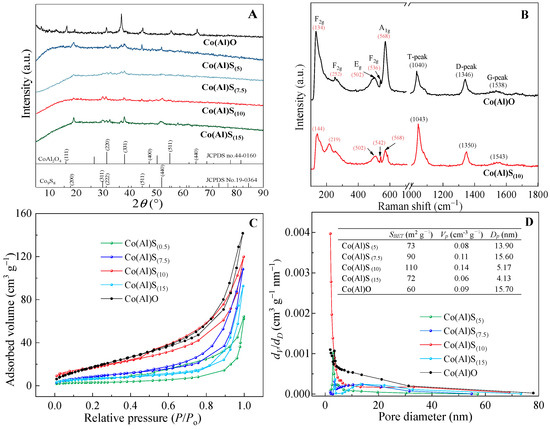 (A) XRD patterns of the Co(Al)O and the Co(Al)S; (B) Raman spectra of the Co(Al)O and the Co(Al)S(10); (C) N2 adsorption–desorption isotherms; (D) pore size distributions of the Co(Al)O and the Co(Al)S.