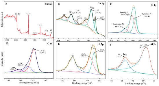 The surface chemical state and composition of the Co(Al)S(10) were clarified by XPS, as shown in Figure 4. The XPS survey spectrum revealed Co, O, N, C, Al and S elements (Figure 4A), which coincided with the SEM-EDS and HAADF-STEM results. The O element came from adventitious O species, which was confirmed by O 1s spectrum (Figure S5) and C 1s spectra (Figure 4D). The peaks at 288.5 and 284.7 eV were attributed to the O-C=O mode of absorbed CO2 from air [40] and the C-C bond of adventitious carbon as calibration references [41], respectively, while the peak at 286.0 eV was ascribed to the C-N bond [42]. Additionally, the N 1s spectrum (Figure 4C) displayed the peaks assigning to pyridinic N (399.4 eV), pyrrolic N (400.2 eV) and quaternary N (402.1 eV) [43], ensuring the C and N species in the Co(Al)S matrix. The Co 2p XPS spectrum (Figure 4B) was composed of two spin-orbit doublets (2p1/2 and 2p3/2) and two shake-up satellites (denoted as Sat.), where the fitting peaks at 797.7 and 781.6 eV were ascribed to the Co2+ state, and the other peaks at 793.5 and 778.4 eV were the typical Co3+ state [39,41]. In the S 2p spectrum (Figure 4E), the peaks at around 163.0 and 161.7 eV were related to metal–sulfur bonds (Co-S) from S2− [39]. The Al 2p XPS showed two peaks at 74.2 eV (Al 2p1/2) and 68.2 eV (Al 2p3/2) due to coordination of Al3+ [39,44] (Figure 4F).