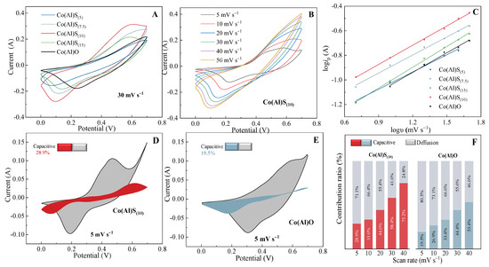 (A) CV curves of the Co(Al)O and the Co(Al)S at 30 mV s–1; (B) CV curves of the Co(Al)S(10) at different scan rates; (C) plots of logi vs. logυ for the CoAl2O4 and the Co(Al)S; (D) capacitive contribution of the Co(Al)S(10) and the Co(Al)O (E) at 5 mV s–1; (F) histograms of the capacitance contributions for the Co(Al)S(10) (red area) and the Co(Al)O (blue-gray area) at different scan rates.