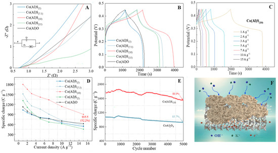 Nyquist plots (A) and GCD profiles at 1 A g−1 (B) of the Co(Al)O and the Co(Al)S; GCD profiles of the Co(Al)S(10) at different current densities (C); specific charges of the Co(Al)O and the Co(Al)S at different current densities (D); cycling stability of the Co(Al)O and the Co(Al)S(10) (E); schematic illustration of the energy storage mechanism of the Co(Al)S (F).