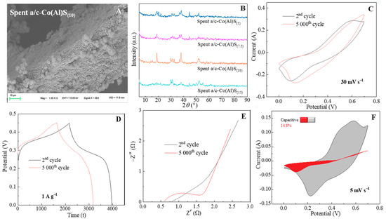 SEM(A) and XRD images (B) of the spent Co(Al)S(10); CV curves at 30 mV s–1 (C); GCD profiles at 1 A g–1 (D); and Nyquist plots (E) of the Co(Al)S(10) before and after 5000 cycles. Capacitance contribution (F) of the spent Co(Al)S(10) at 5 mV s−1.